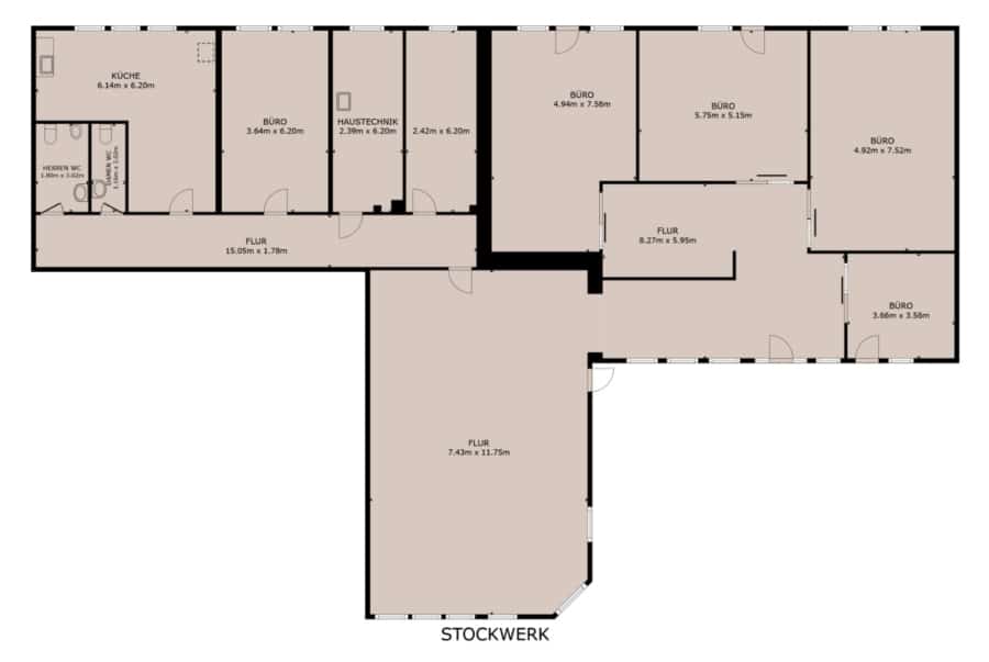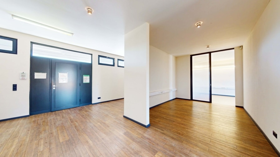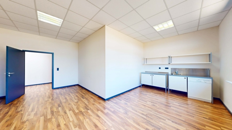 Ein großzügiger Flur sorgt für eine angenehme Verbindung aller Bereiche und bietet ausreichend Bewegungsfreiheit. Eine voll ausgestattete Küche, getrennte Sanitärräume sowie ein Technikraum komplettieren die Immobilie und sorgen für eine komfortable Infrastruktur im Arbeitsalltag.