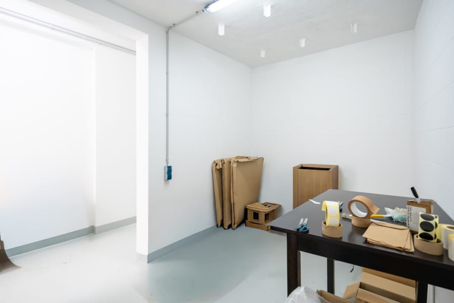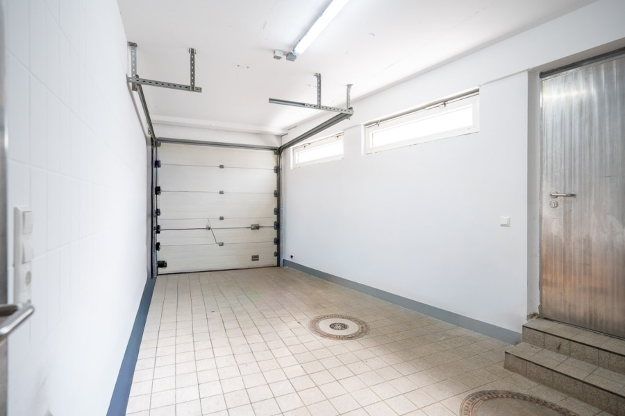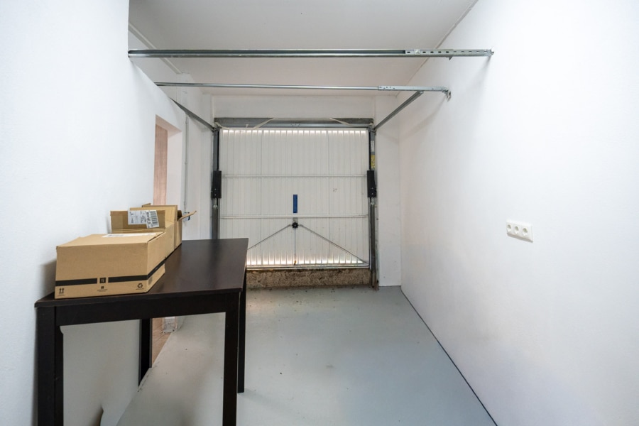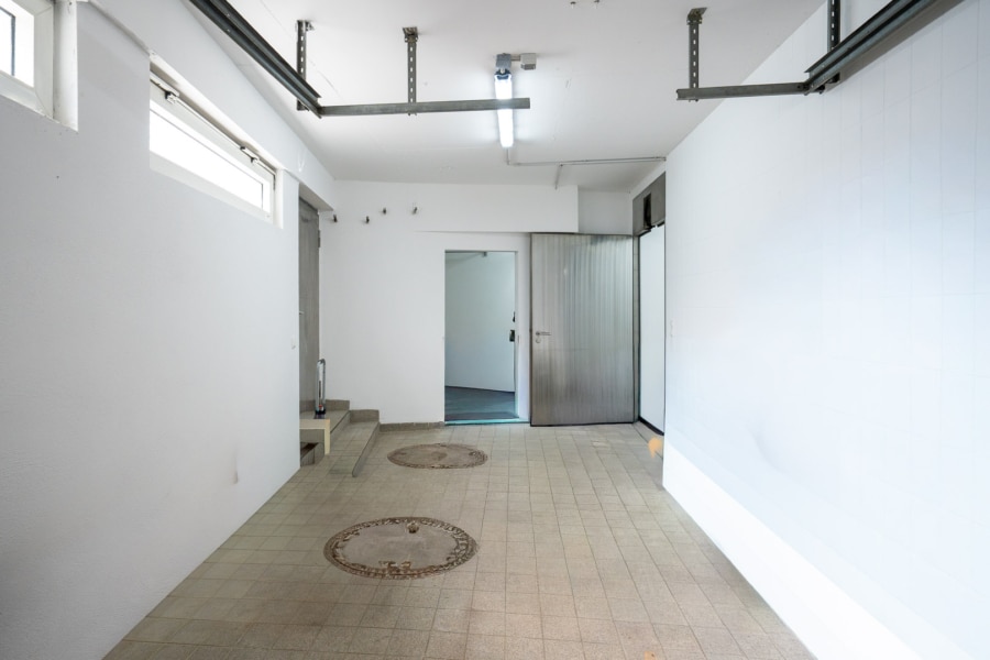Der Zugang erfolgt über zwei Garagentore, die eine unkomplizierte Anlieferung ermöglichen, sowie über einen separaten Eingang. Im Inneren gliedert sich die Fläche in mehrere Bereiche, die sich gut für eine übersichtliche Organisation von Waren oder Unterlagen nutzen lassen.
