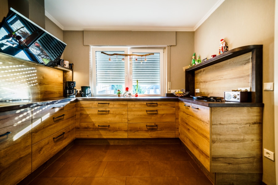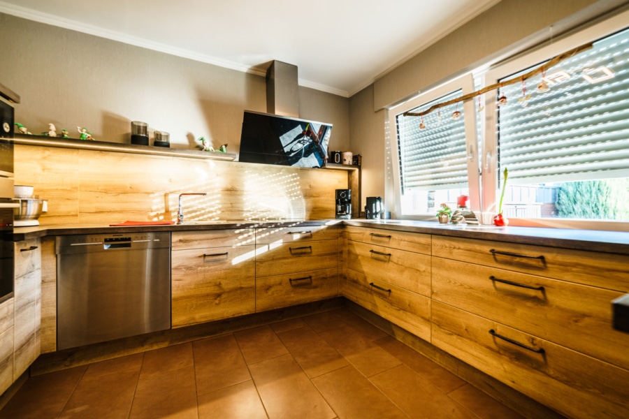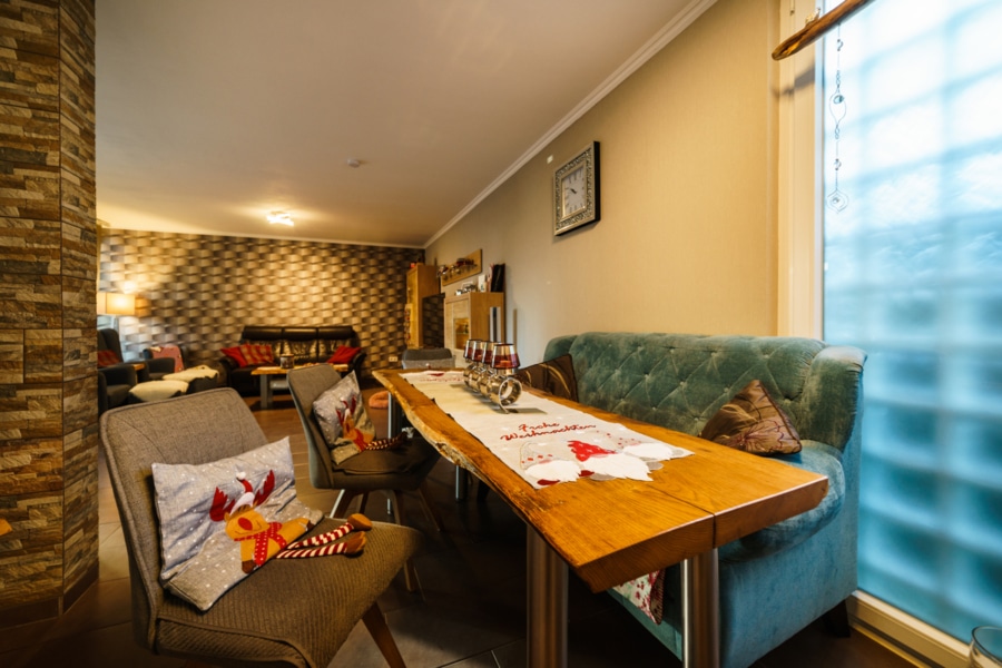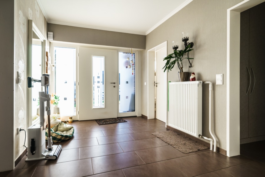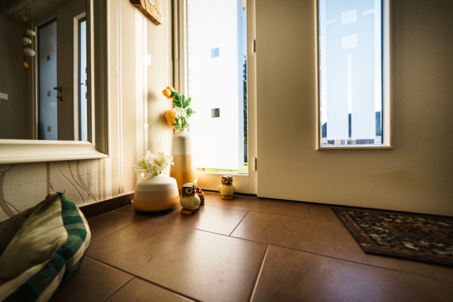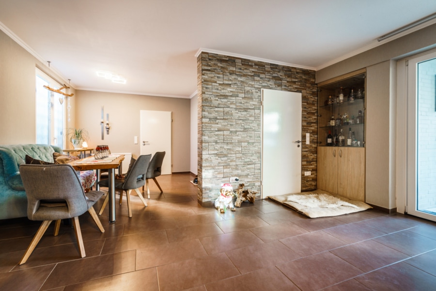 Beim Betreten des Hauses werden Sie von einem einladenden Flur empfangen, der Ihnen Zugang zu allen Bereichen bietet. Zur Linken befindet sich ein modernes Gäste-WC , das Ihre Gäste willkommen heißt. Rechts führt der Weg in die hochwertig ausgestattete, moderne Küche , die mit ihrem offenen Übergang in den großzügigen Wohn- und Essbereich beeindruckt.