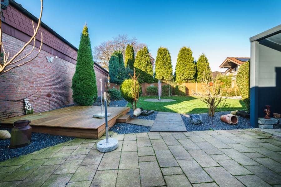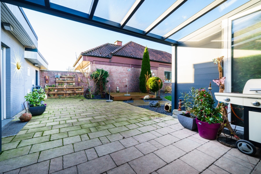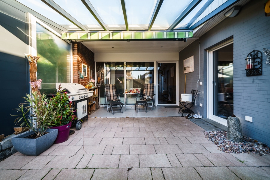 Der lichtdurchflutete Wohnbereich öffnet sich zur überdachten Terrasse , die an lauen Sommerabenden zum Verweilen einlädt. Der vollständig abgeschlossene Garten bietet Ihnen absolute Privatsphäre und wird schnell zu Ihrem Lieblingsplatz – ob für entspannte Stunden mit der Familie oder gesellige Runden mit Freunden.