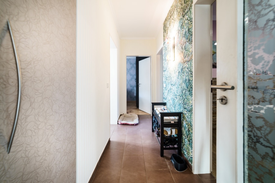 Über den Flur gelangen Sie ebenfalls in zwei behagliche Schlafräume , die ausreichend Platz für Ihre Familie oder Gäste bieten. Einer der Schlafräume gewährte direkten Zugang zur Terrasse – ideal, um den Tag mit einem frischen Blick ins Grüne zu beginnen.