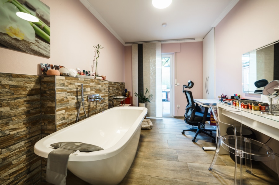 Ein besonderes Highlight des Hauses ist ein individuell gestalteter Raum , den Sie vom Flur aus erreichen. Hier vereinen sich Funktion und Entspannung auf einzigartige Weise: Neben einer stilvollen Badewanne bietet der Raum Platz für ein gemütliches Büro – eine perfekte Symbiose aus Produktivität und Wellness.