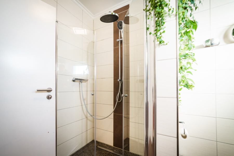 Das moderne Hauptbadezimmer besticht durch eine ebenerdige Dusche, ein WC und ein elegantes Waschbecken. Die hochwertige Ausstattung und die durchdachte Gestaltung schaffen eine luxuriöse Atmosphäre, die jeden Morgen verschönert.