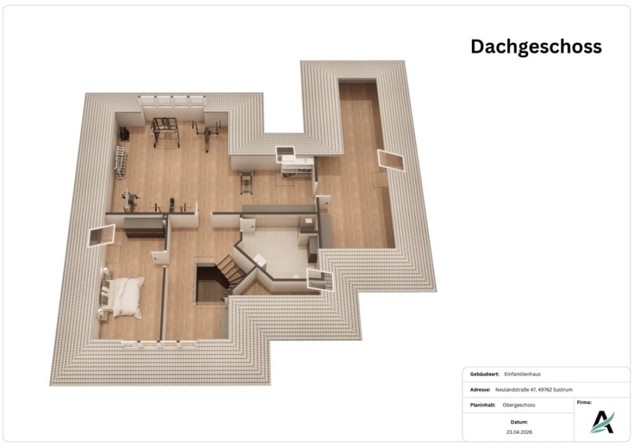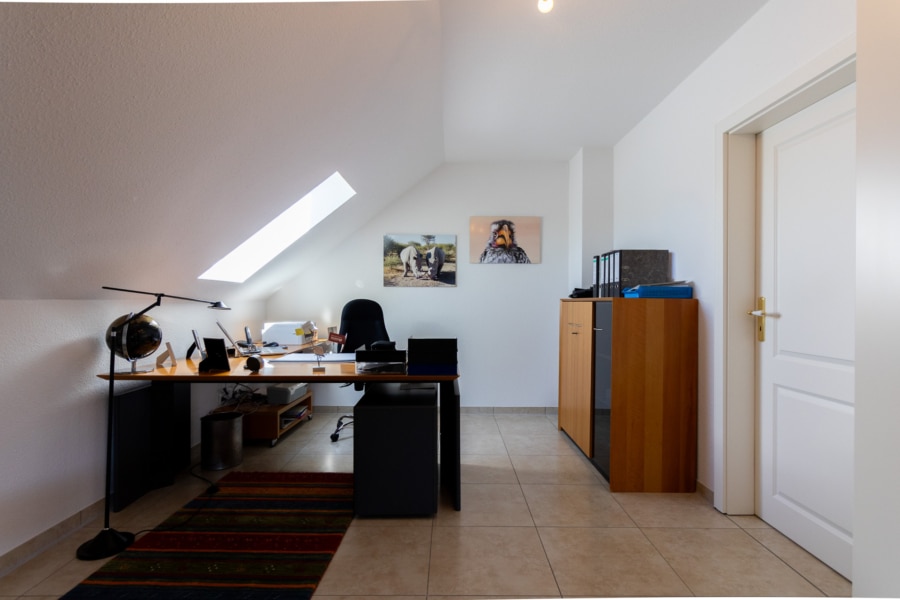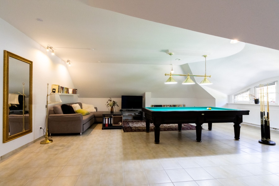 Im Dachgeschoss erwartet Sie ein weiterer vielseitig nutzbarer Bereich mit Gästezimmer inklusive Bad, einem großen Hobbyraum mit Fitnessbereich sowie ausreichend Platz für Freizeitaktivitäten. Ein zusätzlicher Abstellraum rundet das Raumangebot ab.