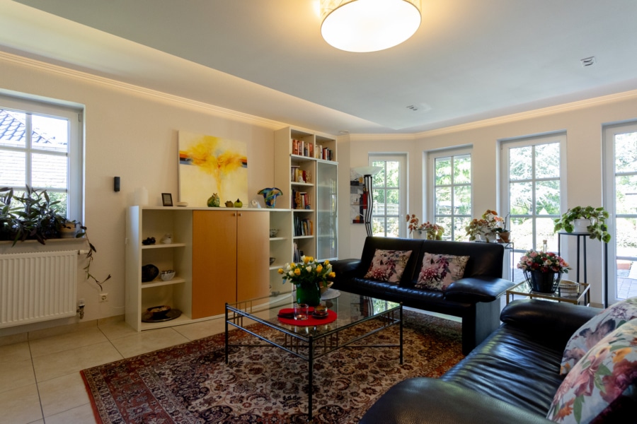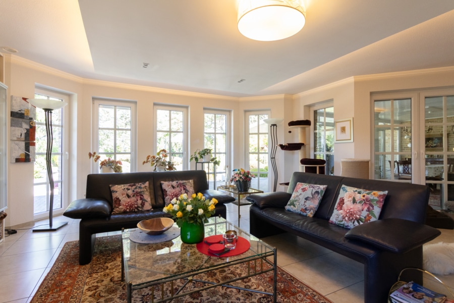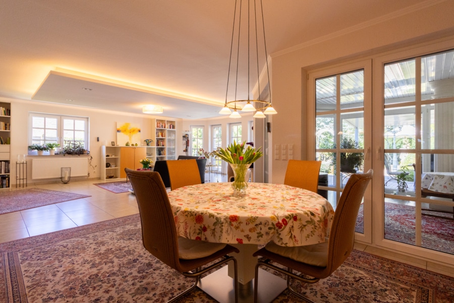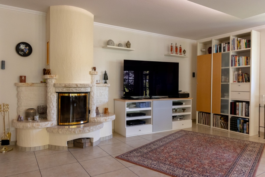 Der anschließende Wohn- und Essbereich präsentiert sich äußerst großzügig und lichtdurchflutet. Große Fensterflächen eröffnen einen wunderbaren Blick in den gepflegten Garten und in die angrenzende Natur. Der Raum bietet zudem ausreichend Platz für besondere Ausstattungsdetails . Ein hochwertiger Natursteinkamin mit dekorativen Elementen sorgt zusätzlich für eine gemütliche Atmosphäre.