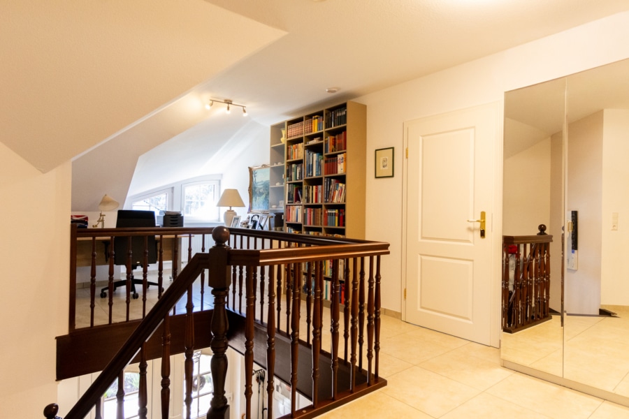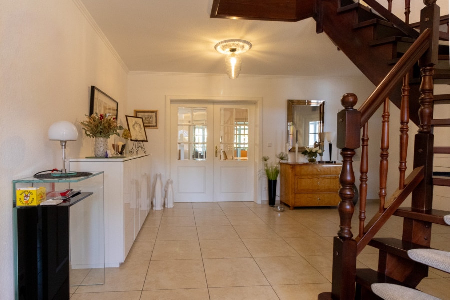 Bereits beim ersten Eindruck zeigt sich die besondere Qualität dieser Immobilie: Das Haus wirkt einladend, großzügig und zugleich elegant. Beim Betreten empfängt Sie eine repräsentative Eingangshalle mit einer eindrucksvollen Vollholztreppe sowie einer offenen Galerie, die dem Haus ein besonderes Raumgefühl verleiht.