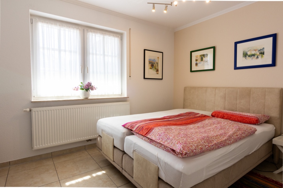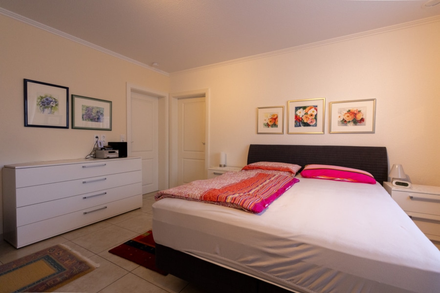 Vom Eingangsbereich aus gelangen Sie in ein geräumiges Schlafzimmer mit direktem Zugang zu einem komfortablen Badezimmer. Darüber hinaus stehen ein weiteres Zimmer, ideal als Gäste- oder Arbeitszimmer, sowie ein Gäste-WC zur Verfügung.
