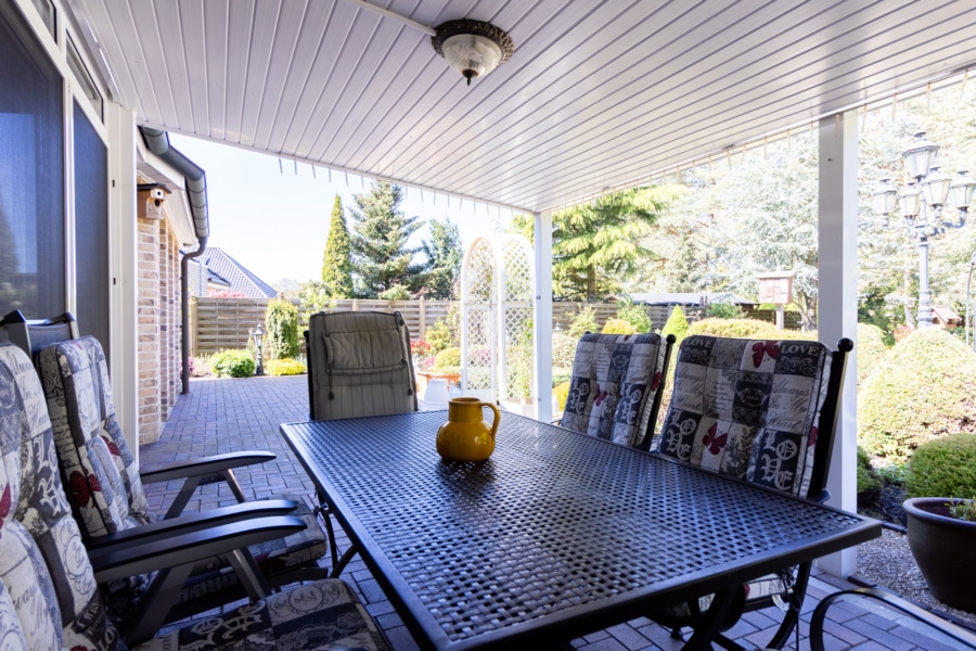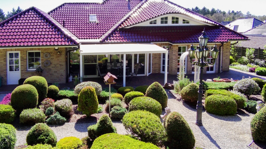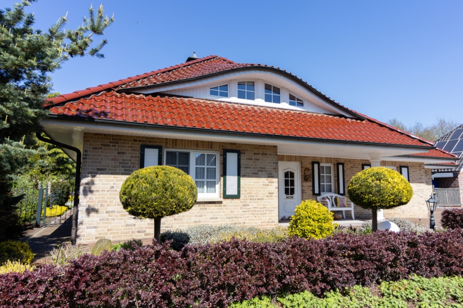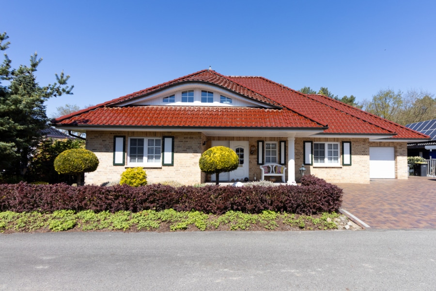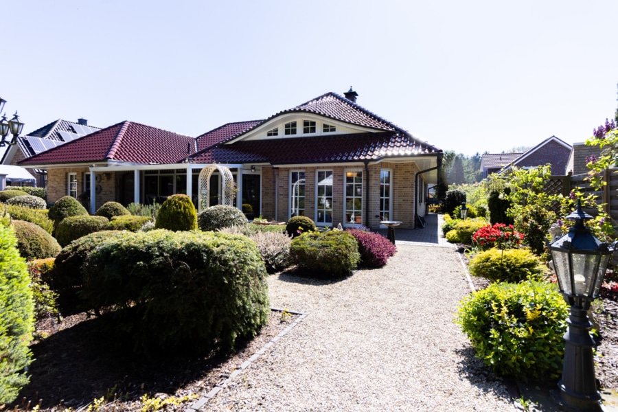 Dieser stilvolle Winkelwalmdach-Bungalow überzeugt durch seine hochwertige Bauweise und seine exklusive Ausstrahlung. Er befindet sich auf einem ca. 983 m² großen, liebevoll angelegten Grundstück in ruhiger und naturnaher Waldrandlage in der Nähe von Lathen.