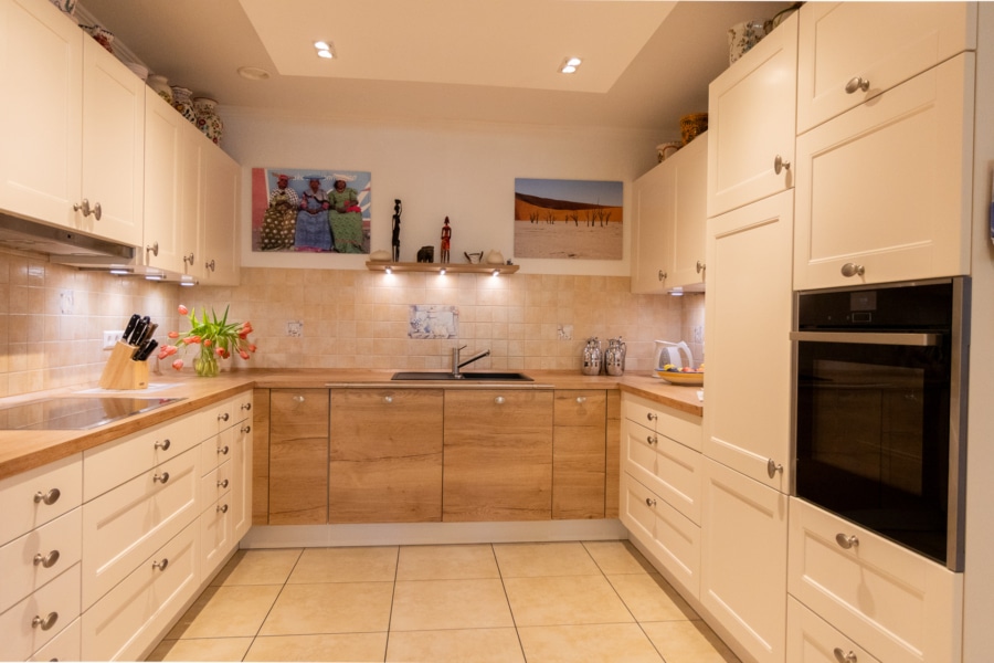 Die Küche ist vollständig ausgestattet und bereits im Kaufpreis enthalten. Angrenzend befinden sich ein praktischer Hauswirtschaftsraum sowie ein Abstellraum. Von hier aus erreichen Sie ebenfalls die großzügige Garage mit gefliestem Boden, elektrischem Sektionaltor und zusätzlicher Nutzfläche.