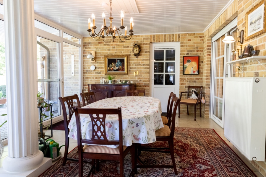 Ein Wintergarten, der nachträglich angebaut wurde, verbindet Wohnbereich und Küche und bietet einen herrlichen Blick in den Garten – perfekt zum Entspannen zu jeder Jahreszeit.
