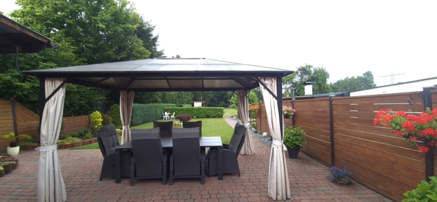 Der Außenbereich überzeugt mit gepflasterter Terrasse, gepflegtem Garten in Süd-Ost-Ausrichtung, Pavillon sowie weiteren Nebengebäuden inklusive Holzlager und Schuppen. Das großzügige Carport bietet sogar Platz für ein Wohnmobil.