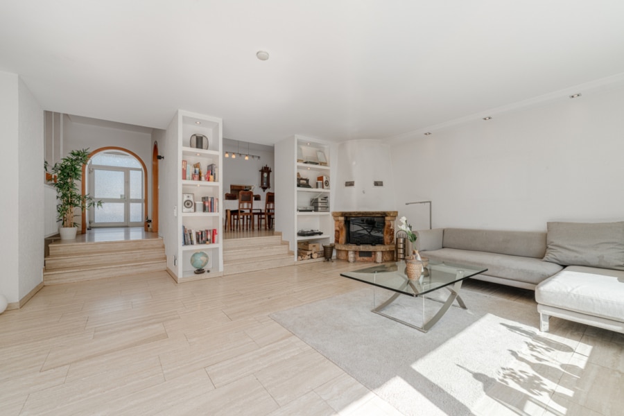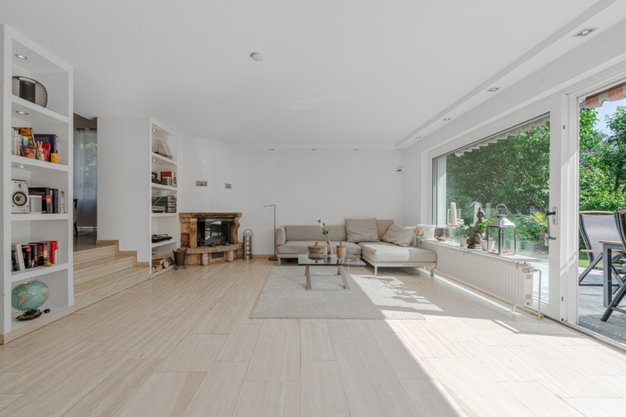 - Wohnzimmer mit Kamin und großem Schiebetürelement zur Terrasse