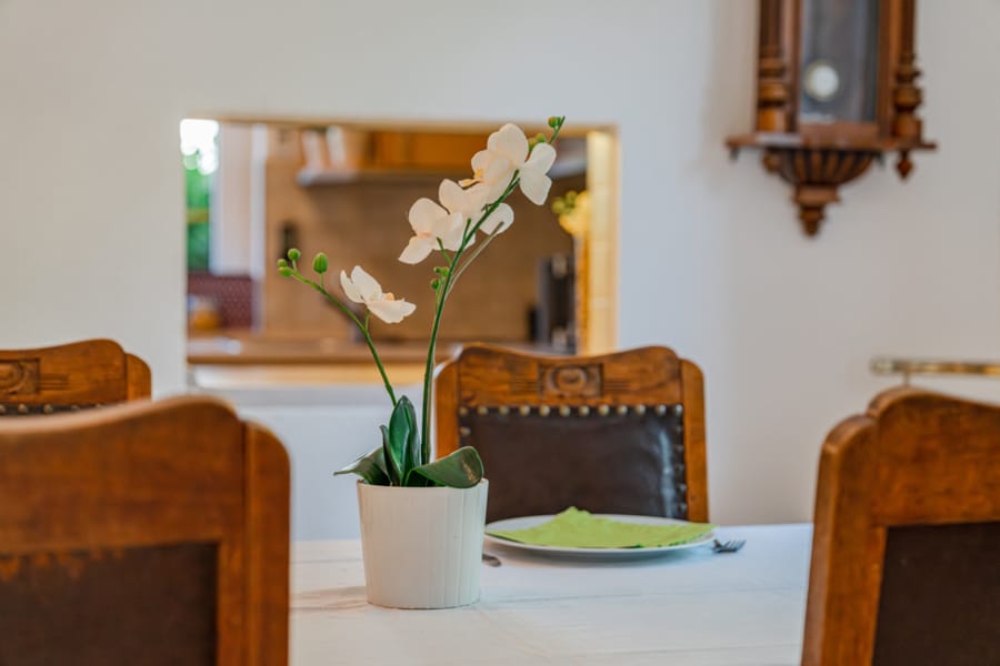 Das Erdgeschoss bietet einen offenen Wohn- und Essbereich mit Kamin und einem großen Schiebetür-Element zur gefliesten Terrasse – ideal für gesellige Sommerabende. Die Küche ist mit einer Einbauküche ausgestattet und durch eine praktische Durchreiche mit dem Esszimmer verbunden. Ein Badezimmer mit Dusche komplettiert das Raumangebot auf dieser Etage.