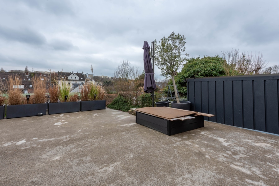 Auch die Außenbereiche bieten zusätzlichen Wohnwert: Die großzügige Terrasse lädt zum Verweilen ein, während eine zusätzliche Dachterrasse weitere Möglichkeiten im Freien schafft.
