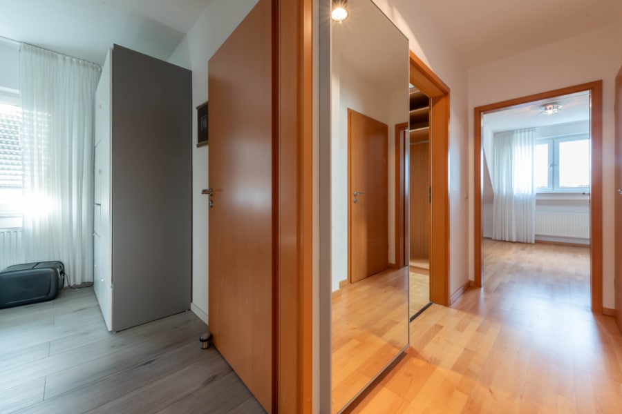 Das Obergeschoss fungiert als privater Rückzugsbereich und umfasst ein Schlafzimmer, ein Arbeits- oder Kinderzimmer sowie ein weiteres Zimmer, das derzeit als Ankleidezimmer mit maßgefertigten Einbauschränken genutzt wird. Das Tageslichtbad ist großzügig geschnitten und verfügt über eine Badewanne, eine Dusche und ein Fenster, was eine angenehme Belichtung und Lüftung gewährleistet.