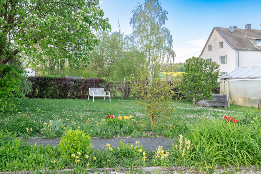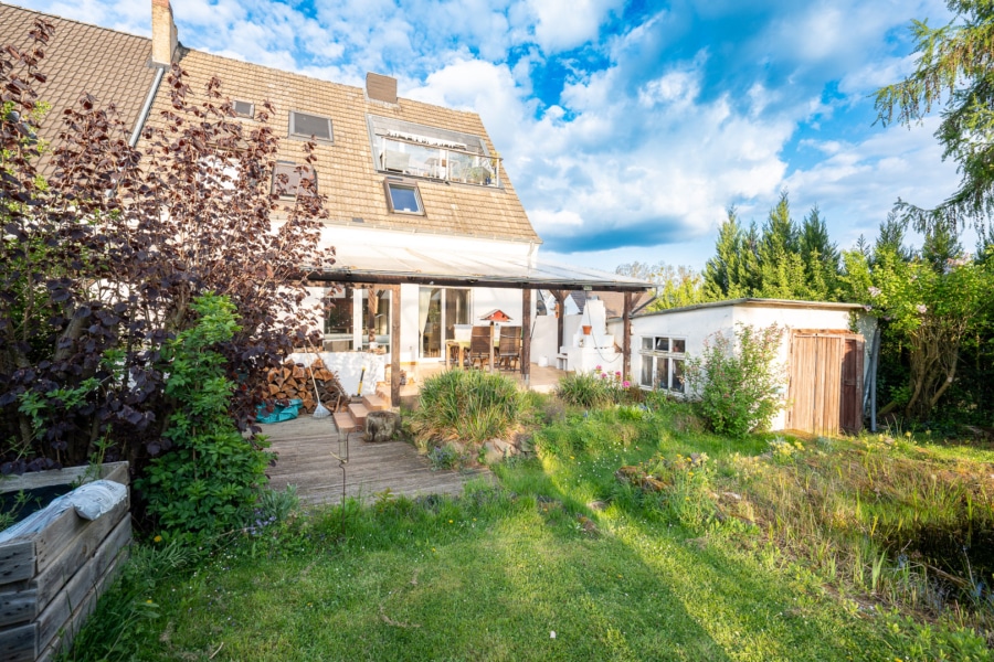 Das sehr große Grundstück mit weitläufigem Garten, Teich und eingelassenem Schwimmbecken bietet viel Raum für Erholung und Gestaltung. Der Vorgarten mit altem Quittenbaum unterstreicht den gewachsenen Charakter.