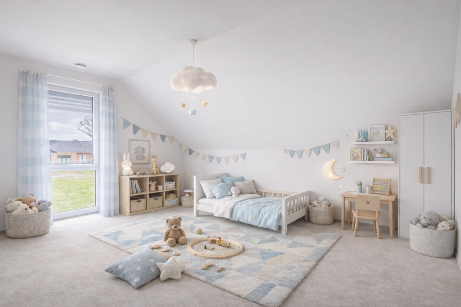 Im Dachgeschoss stehen mehrere flexibel nutzbare Zimmer zur Verfügung – ideal als Schlafzimmer, Kinderzimmer oder Homeoffice.