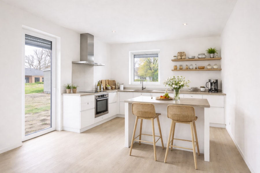 Eine Luft-Wasser-Wärmepumpe in Kombination mit Fußbodenheizung sorgt für effiziente Wärme, während dreifach verglaste Fenster mit elektrischen Rollläden den Wohnkomfort zusätzlich erhöhen.