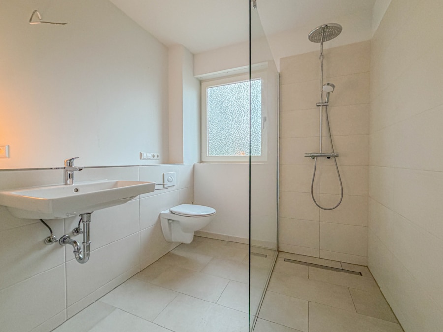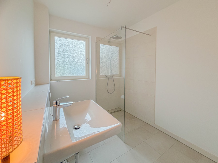 Im Erdgeschoss öffnen sich lichtdurchflutete Räume mit einem klar strukturierten Zuschnitt. Die beiden Schlafzimmer liegen gartenseitig und bieten einen ruhigen Rückzugsort. Der Wohn- und Essbereich mit direktem Zugang auf die große 30-m²-Sonnenterrasse bildet den zentralen Treffpunkt des Hauses. Zur Straßenseite befinden sich der Ess- und Küchenbereich sowie das elegante Tageslichtbad mit begehbarer Dusche und ein separates Gäste-WC. Alle Räume sind vom Flur mit praktischem Einbauschrank aus begehbar.