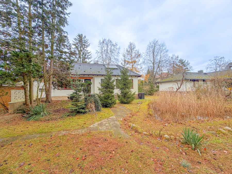 Das 916-m²-Grundstück mit gepflegtem Garten, kleinem Teich, Geräteschuppen und erneuerter Grundwasserpumpe lädt zu entspannten Stunden im Grünen ein. Stellplätze befinden sich direkt vor dem Haus.
