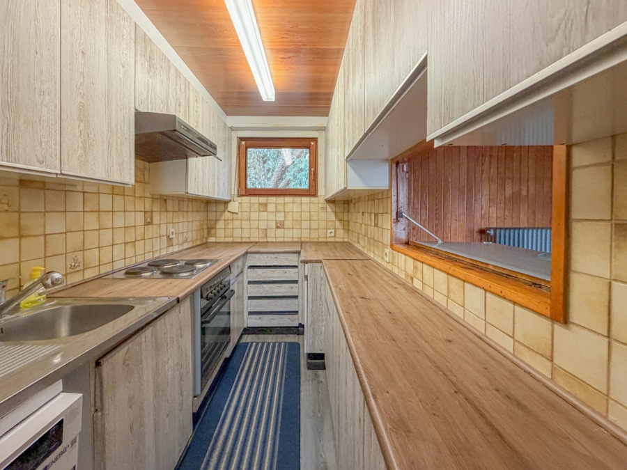 Im Schlafzimmer ist ausschließlich Platz für ein Bett, weitere Möblierung ist nicht möglich. Die vorhandene Einbauküche bietet überdurchschnittlichen Stauraum, schränkt jedoch die individuelle Gestaltung etwas ein.