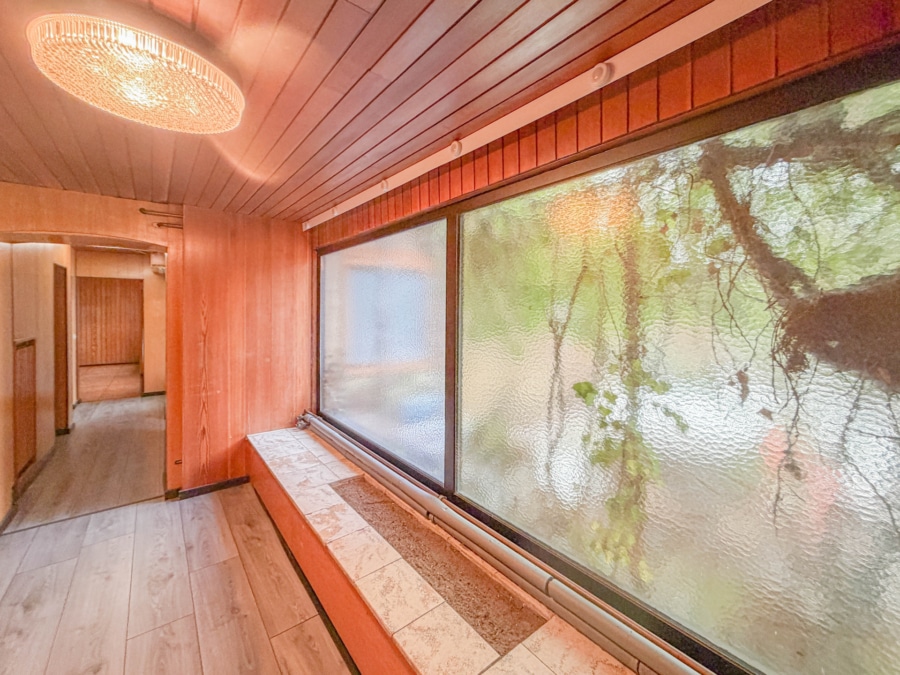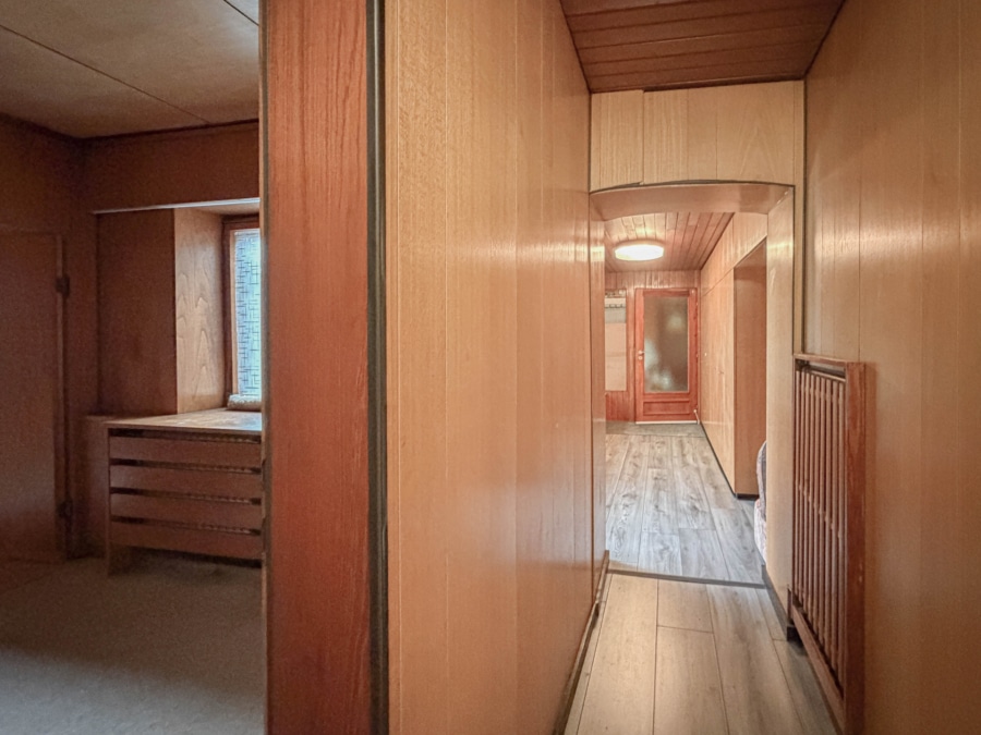 Die Wohnung besitzt eine vollständig in Holz gehaltene Innenausstattung mit Parkett im Wohnzimmer sowie Wand- und Deckentäfelungen in allen Räumen. Zahlreiche Einbauschränke bieten viel Stauraum.