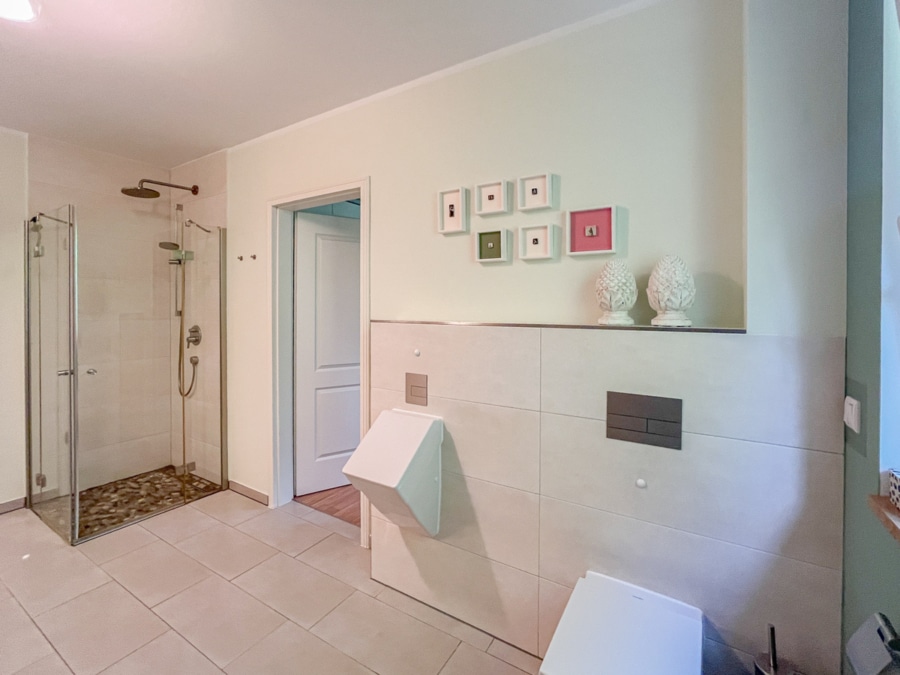 Ebenfalls im Erdgeschoss befinden sich ein Gäste-WC, ein Arbeitszimmer sowie ein Hauswirtschaftsraum mit allen nötigen Anschlüssen für Waschmaschine und Trockner. Ein besonderes Highlight ist das private Fitnesszimmer mit integrierter Sauna und einer großzügigen Walk-in-Doppeldusche – Wellness für Zuhause, wann immer Sie möchten.