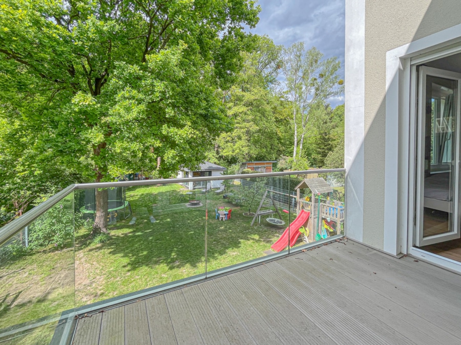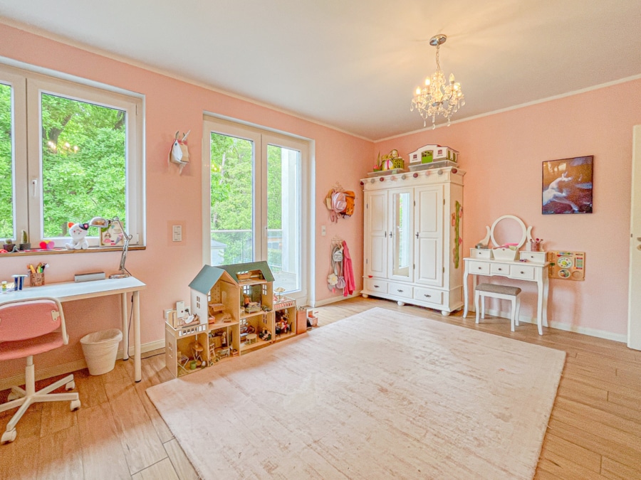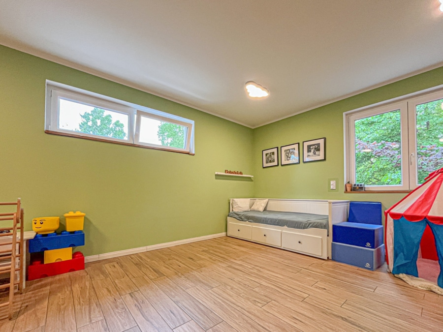 Im Obergeschoss, das etwa 144 m² umfasst, setzt sich das großzügige Raumgefühl fort. Vom Flur aus sind alle Zimmer bequem erreichbar. Das Elternschlafzimmer bietet nicht nur viel Platz, sondern auch einen begehbaren Kleiderschrank sowie direkten Zugang zu einem Balkon. Das Hauptbadezimmer ist stilvoll ausgestattet mit Dusche, Badewanne, Fenster und sogar einem Pissoir. Drei weitere, jeweils ca. 20 m² große Kinderzimmer schaffen perfekte Rückzugsorte für kleine und große Persönlichkeiten.