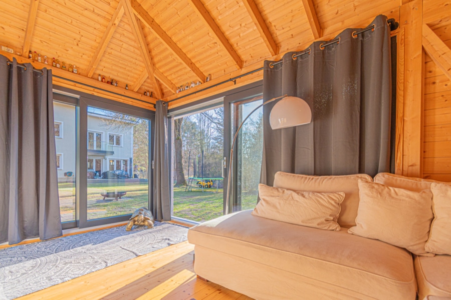 Neben dem Wohnhaus bietet die Immobilie zahlreiche weitere Nutzflächen: Eine massive Doppelgarage aus dem Jahr 2013 ist durch einen Anbau erweitert worden, in dem sich ein Gästezimmer mit eigenem Schlafzimmer und Badezimmer befindet – ideal für Besuch, Au-pair oder heranwachsende Jugendliche, die sich etwas mehr Unabhängigkeit wünschen. Für zusätzliche Flexibilität sorgt ein Holzanbau im Garten (Baujahr 2017) mit ca. 20 m² Fläche und eigenem WC, der sich hervorragend als Atelier, Jugendzimmer oder weiteres Gästezimmer eignet.