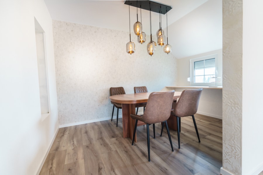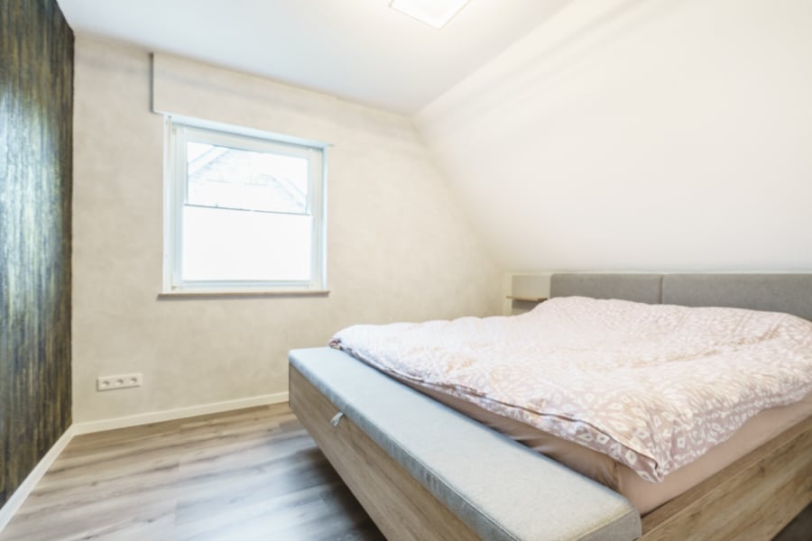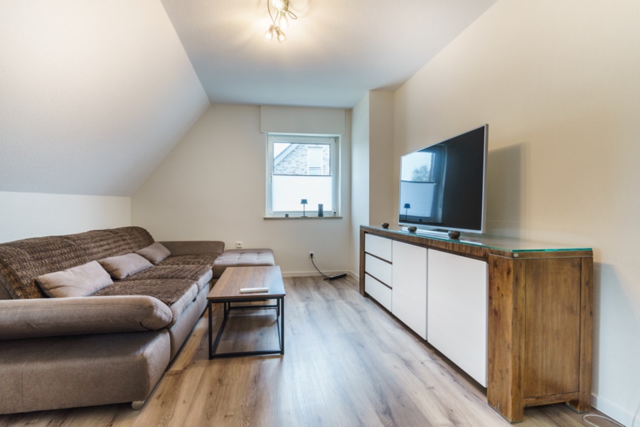 Im Dachgeschoss befindet sich die zweite Wohneinheit, die derzeit vermietet ist. Mit ihren drei Zimmern, darunter ein weitläufiges Wohn- und Esszimmer sowie zwei Schlafräumen, eignet sich diese Einheit sowohl für kleine Familien als auch für Paare mit Platzbedarf. Die moderne Küche ist funktional gestaltet und bietet alles, was man im Alltag benötigt. Ein besonderes Highlight ist das Badezimmer mit einer bodentiefen Dusche – stilvoll ausgestattet und modernisiert, vermittelt es ein Gefühl von Wohlbefinden und Komfort. Die hellen Räume und der durchdachte Grundriss sorgen für ein angenehmes Wohngefühl, das Mieter und Eigentümer gleichermaßen zu schätzen wissen.