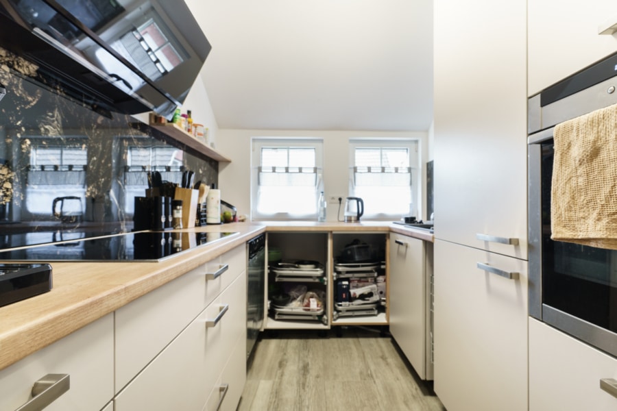 Die Küche ist klassisch geschnitten und bietet Raum für kulinarische Kreativität. Das Badezimmer verfügt über eine bodentiefe Dusche und wird durch Tageslicht angenehm erhellt. Der Schnitt der Wohnung ist durchdacht und vermittelt das Gefühl von Offenheit und Geborgenheit zugleich.