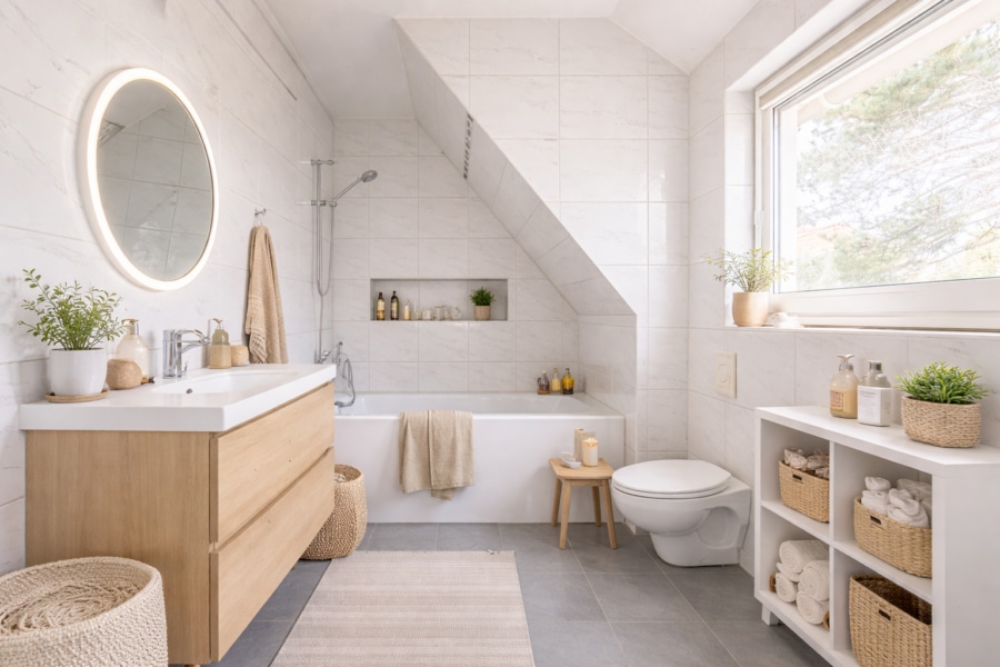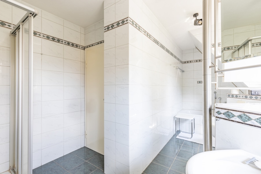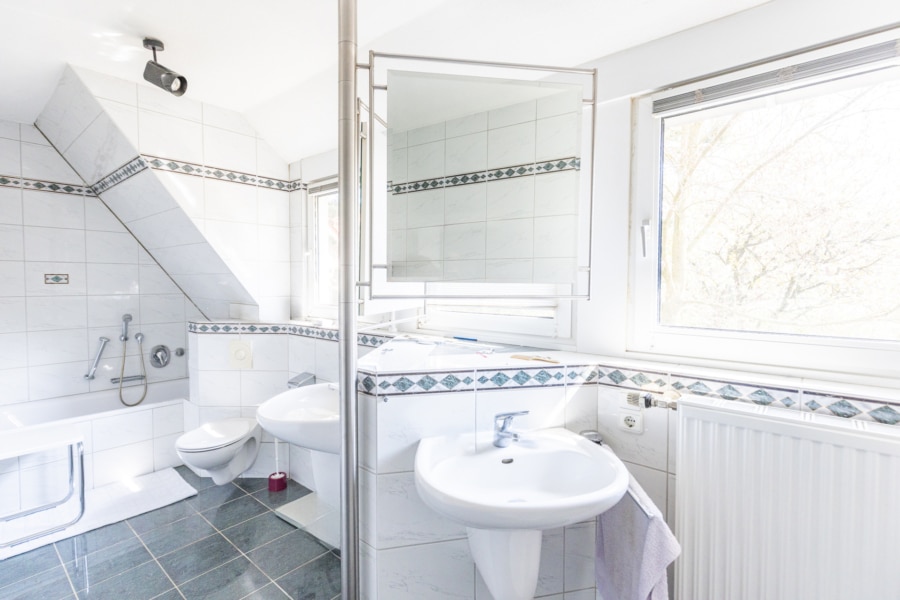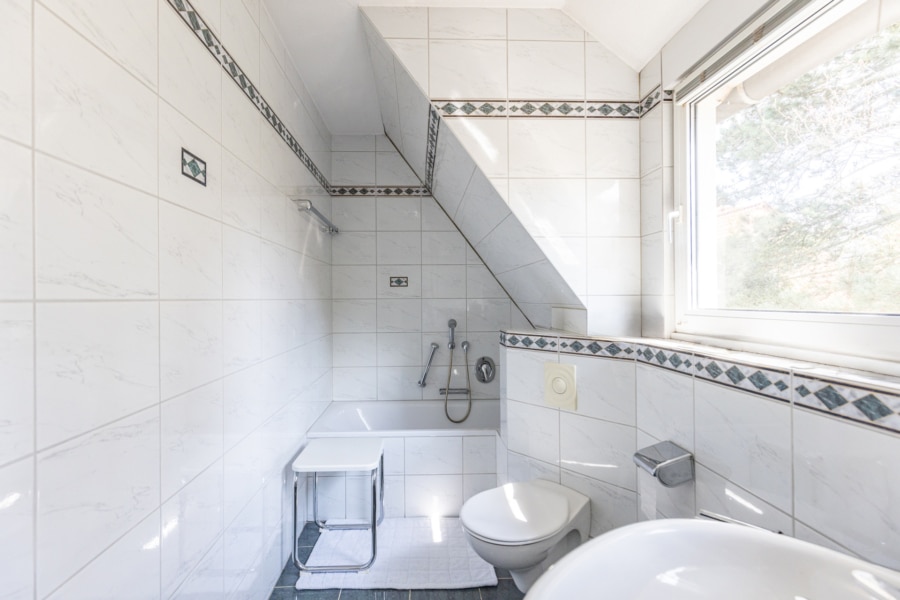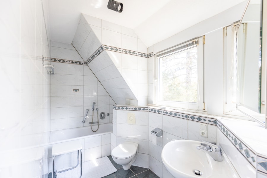 Das Badezimmer im Obergeschoss wurde modern und zeitlos gestaltet und erfüllt Ansprüche an Ausstattung und Komfort. Es verfügt sowohl über eine bodentiefe Dusche als auch über eine Badewanne und bietet damit ideale Voraussetzungen für den Alltag sowie entspannte Momente. Die im Obergeschoss verbauten Kunststofffenster sind pflegeleicht und funktional und tragen zu einem angenehmen Wohnklima bei.