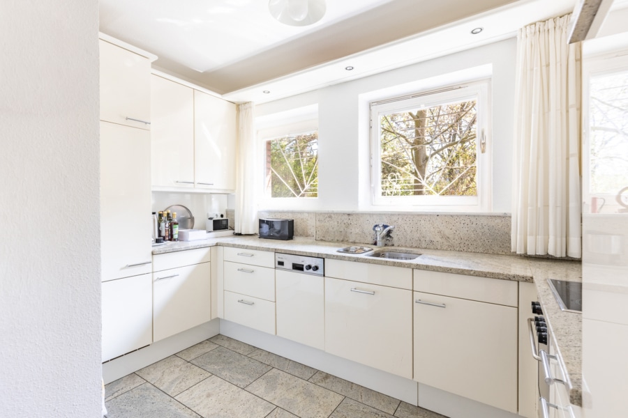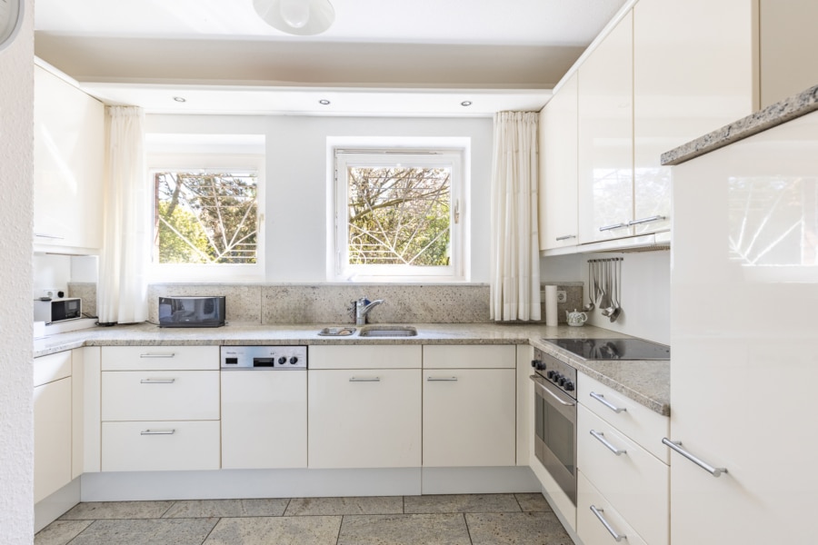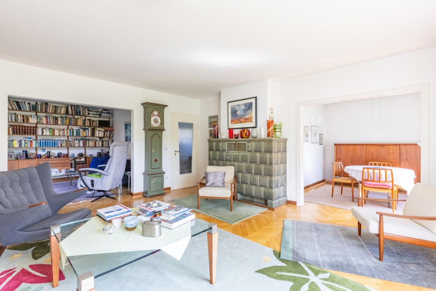 Im Erdgeschoss befindet sich der zentrale Wohnbereich, der durch seine Großzügigkeit und eine besonders angenehme Wohnatmosphäre überzeugt. Der Wohn- und Essbereich ist offen gestaltet und beeindruckt durch seine Weitläufigkeit, wodurch ein modernes und kommunikatives Wohngefühl entsteht. Dieser großzügige Bereich bildet den Mittelpunkt des Hauses und bietet viel Platz für gemeinsames Leben, Essen und Entspannen. Der im Zuge der Renovierung erneuerte Kachelofen sorgt hierbei zusätzlich für eine behagliche Atmosphäre und unterstreicht den wohnlichen Charakter. Die moderne Einbauküche ist funktional gestaltet und fügt sich harmonisch in das Gesamtbild ein. Hochwertige Einbauschränke bieten zusätzlichen Stauraum und tragen ebenso wie die überarbeiteten Innentüren zum gepflegten Erscheinungsbild bei. Die im Erdgeschoss verbauten Holzfenster verleihen den Räumen eine warme und klassische Ausstrahlung.