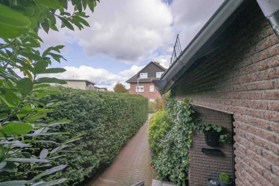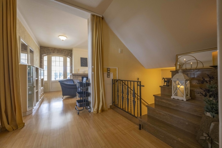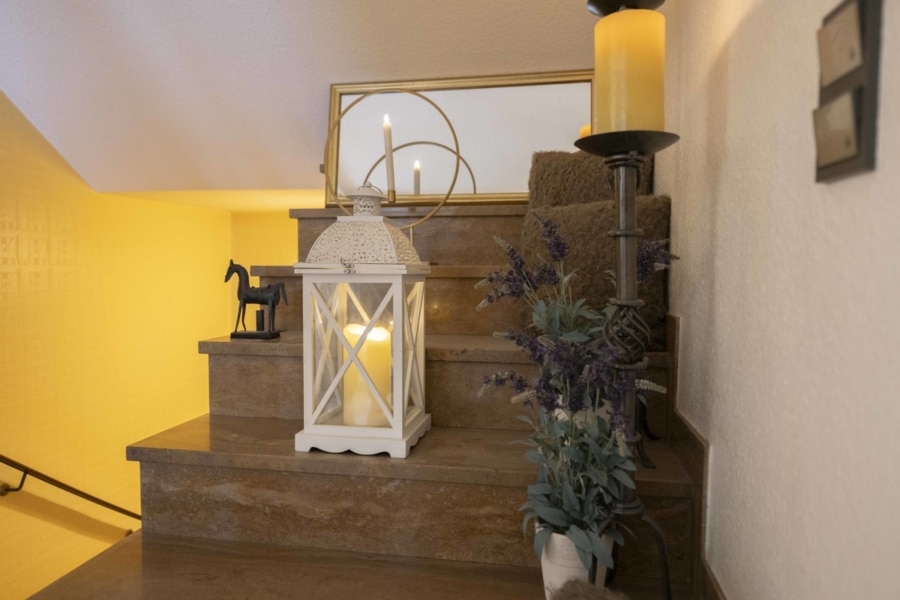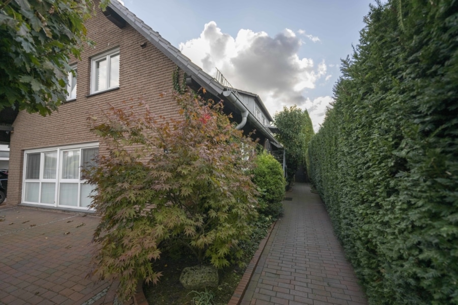 Sowohl der Zugang zur Hauptwohnung im Erdgeschoss als auch zur Wohnung im Obergeschoss erfolgt über einen stilvoll angelegten, gepflasterten Eingangsbereich.