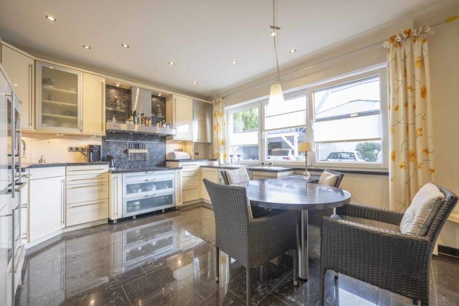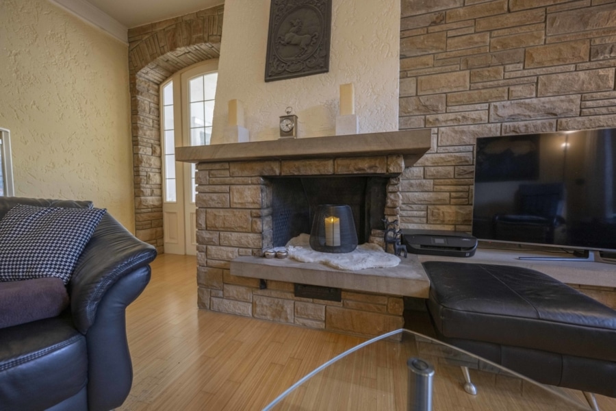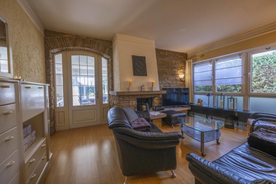 Ein besonderes Highlight ist das lichtdurchflutete Wohnzimmer mit Kamin und direktem Zugang zur Terrasse.