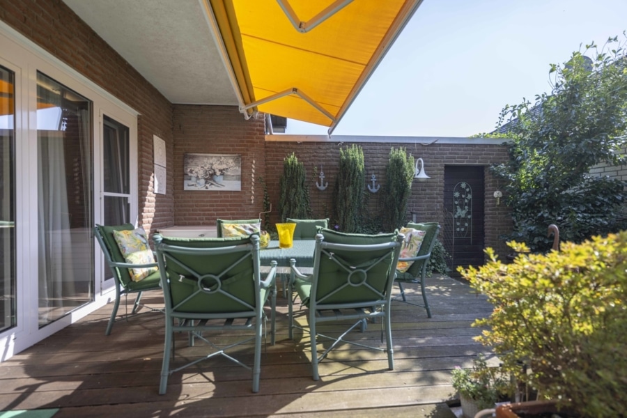 Der Garten mit einer Terrasse und gepflegtem Rasenbereich bietet einen idyllischen Rückzugsort und ist durch hohe Hecken von den Nachbargrundstücken abgeschirmt.
