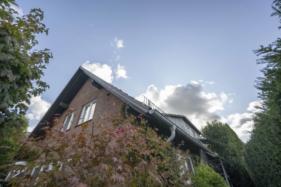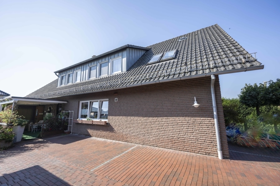 Die gepflegte Fassade im rot verklinkerten Stil fügt sich harmonisch in die Umgebung ein, während die großen Gauben mit silbernen Verkleidungen und das Satteldach mit dunklen Dachpfannen das Gesamtbild abrunden.