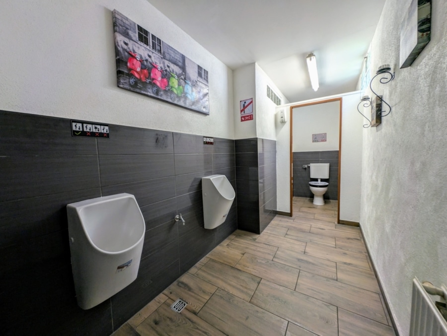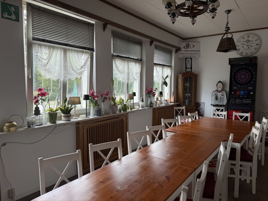 Im Erdgeschoss erwartet Sie eine vollständig ausgestattete und im Betrieb befindliche Gaststätte mit einer Nutzfläche von ca. 140 m². Herzstück des Gastraums ist der stilvolle Schankbereich mit Theke und Kamin – hier trifft gemütliche Atmosphäre auf rustikalen Charme. Ein angrenzender Essbereich bietet ausreichend Platz für den täglichen Betrieb. Ergänzt wird das Angebot durch einen separaten Gesellschaftsraum, der für Veranstaltungen mit bis zu 25 Personen ideal geeignet ist – oder flexibel in den regulären Betrieb eingebunden werden kann. Die Küche ist funktional ausgestattet und sofort einsatzbereit. Die Sanitäranlagen wurden 2021 umfassend saniert und erfüllen aktuelle Standards. Zusätzlich steht im Erdgeschoss ein separates Büro zur Verfügung, das optimal zur Verwaltung des Gaststättenbetriebs genutzt werden kann.