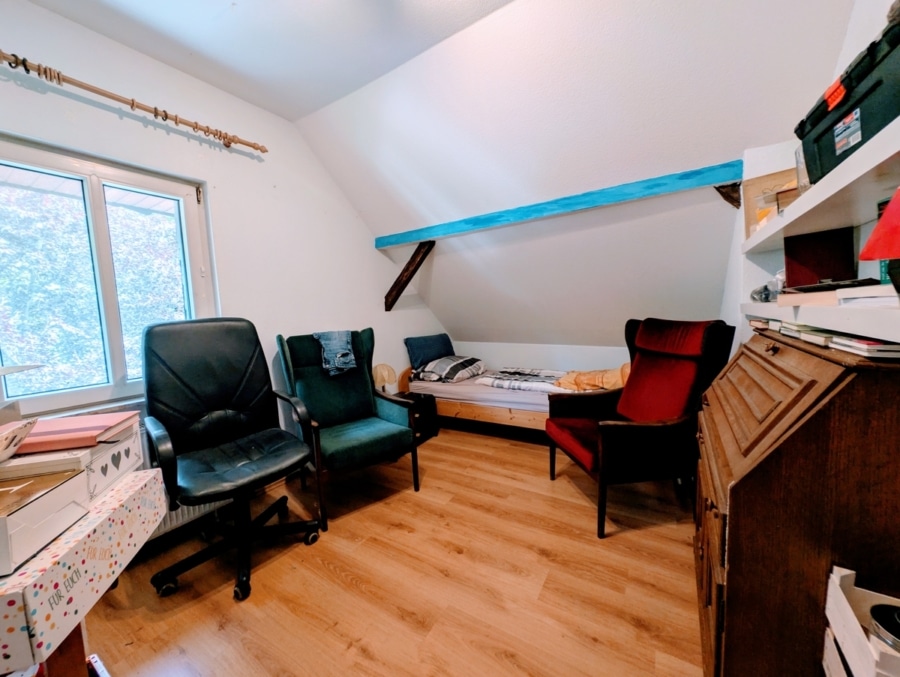 Über einen separaten Eingang gelangt man in den privaten Wohnbereich, der sich über das Ober- und Dachgeschoss erstreckt. Die ca. 120 m² große Eigentümerwohnung bietet ein großzügiges Raumangebot: ein helles Wohnzimmer mit Essbereich, eine 2021 modernisierte Küche, ein großes Badezimmer mit Wanne und Dusche im Dachgeschoss, ein Badezimmer mit Wanne im 1. Obergeschoss sowie drei gut geschnittene Schlafzimmer und ein zusätzlicher Ankleideraum. Der Balkon lädt zum Entspannen mit Blick ins Grüne ein.