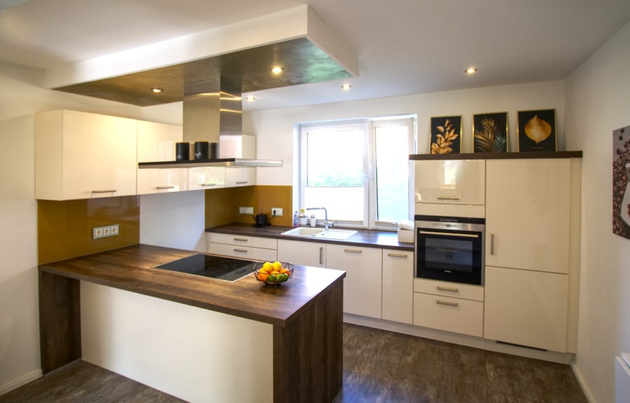 •Hochwertige Hochglanz-Einbauküche (Beige, Siemens-Geräte, autarkes Ceranfeld, Kochinsel)