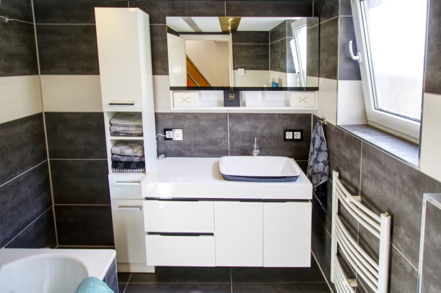 •Vollbad mit Badewanne, WC, Handtuchheizung und Fenster im KG