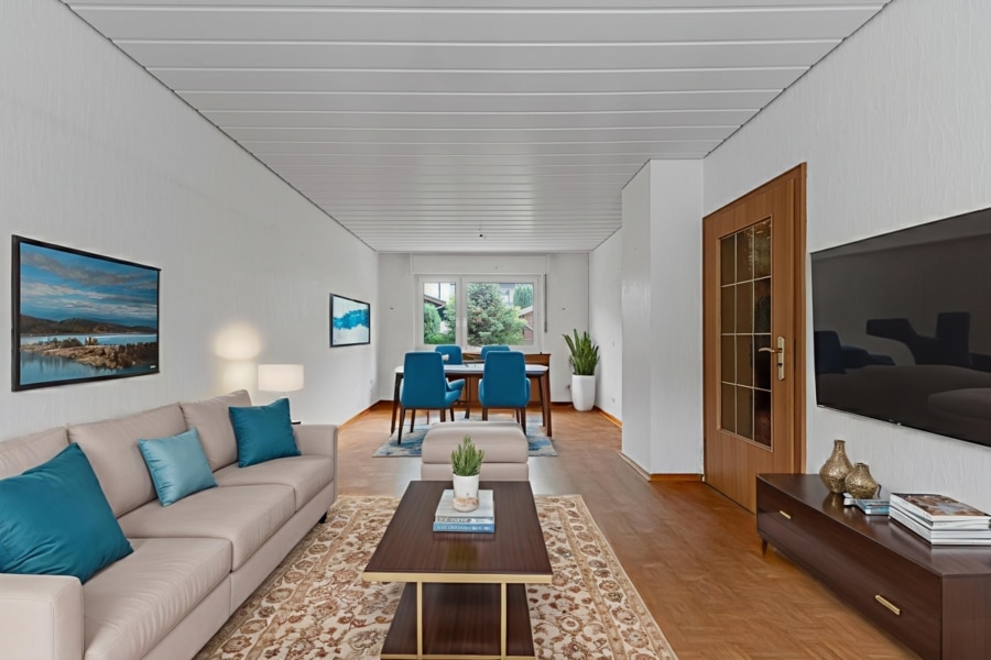 Im Erdgeschoss befinden sich das Wohn- und Esszimmer mit direktem Zugang zur Terrasse und dem gepflegten Garten. Die Küche ist separat und lässt sich je nach Bedarf öffnen oder modernisieren. Ein Gäste-WC rundet das Erdgeschoss ab.