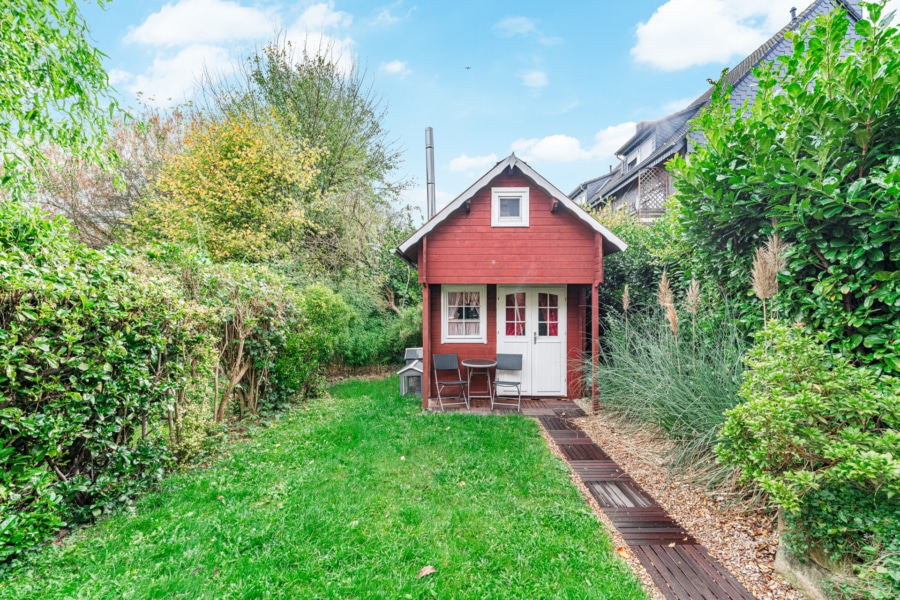 Ein besonderes Highlight ist der liebevoll angelegte Garten mit Süd-Ausrichtung. Das zweigeschossige Gartenhaus begeistert mit einer gemütlichen Sitzecke samt Kamin im Erdgeschoss – und einer oberen Ebene, die sich perfekt für Spielspaß oder unvergessliche Übernachtungspartys für Kinder eignet.