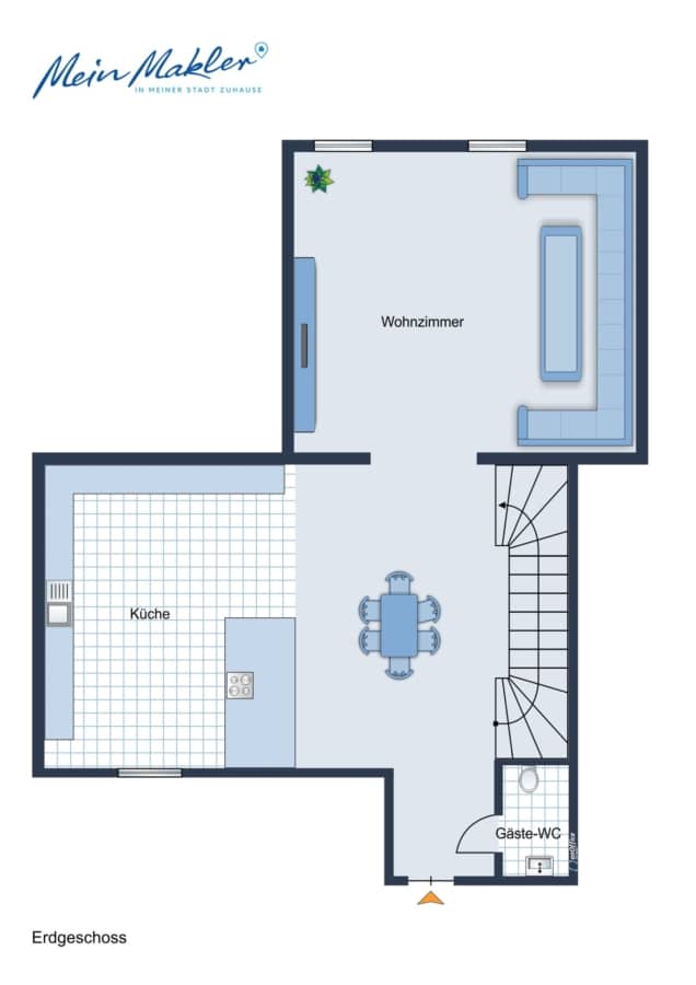 Im Erdgeschoss empfängt Sie der Eingangsbereich mit einem modernen Gäste-WC (2015). Die offene Küche mit Kochinsel bildet gemeinsam mit dem angrenzenden Wohnbereich das Herzstück des Hauses.
