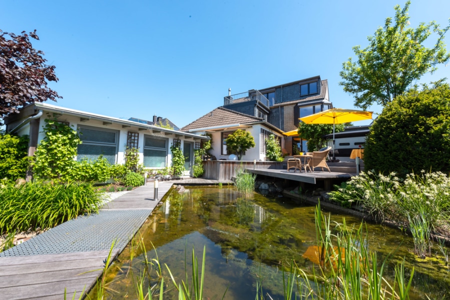 Beim Betreten des Hauses empfängt Sie ein repräsentativer Eingangsbereich mit edlem weißem Marmorboden. Von hier aus gelangen Sie in die großzügige Designerküche der Marke Bulthaup, die sich mit klaren Linien, hochwertigen Küchengeräten und viel Arbeitsfläche präsentiert. Der offen gestaltete Essbereich ist direkt vorgelagert und bietet ein angenehmes Platzangebot – ideal für gesellige Stunden. Sowohl Küche als auch Wohnbereich öffnen sich zur Gartenanlage, die das Herz eines jeden Gartenliebhabers höherschlagen lässt. Mehrere Bankirai-Holzterrassen, eingebettet in Teichanlagen, gliedern den Außenbereich auf natürliche Weise in unterschiedliche Ebenen. Eine großzügige Terrasse mit Markise liegt dem Wohnbereich unmittelbar vorgelagert. Ein weiteres Highlight ist die überdachte Terrasse inmitten zweier Teiche – ein Rückzugsort mit Urlaubsflair, der jeden Sommertag zum Erlebnis macht.