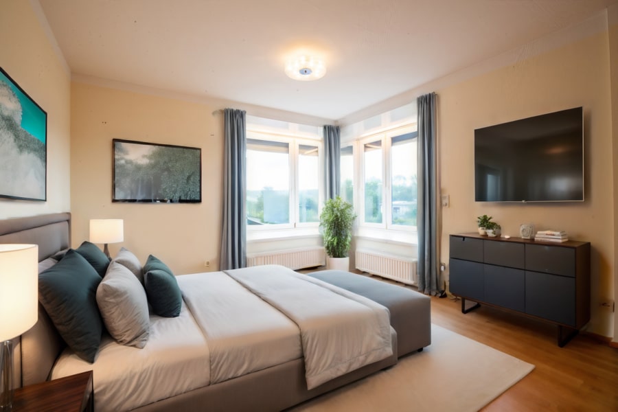 Im Untergeschoss befindet sich der private Schlafbereich der ersten Wohneinheit. Direkt angrenzend liegt ein großzügiger Ankleideraum sowie ein hochwertig ausgestattetes Badezimmer mit Whirlpoolwanne, bodengleicher Dusche, Bidet, Doppelwaschtisch und eleganten Feinsteinzeugfliesen. Abgerundet wird diese Etage durch eine Sauna sowie einen weiteren Raum, der sich ideal als Fitness-, Ruhe- oder Arbeitszimmer eignet. Die moderne Gas-Zentralheizung mit Brennwerttechnik wurde 2016 erneuert und befindet sich in einem separaten Technikraum. Ein innenliegendes Marmortreppenhaus verbindet diese Ebene elegant mit dem Haupteingangsbereich.