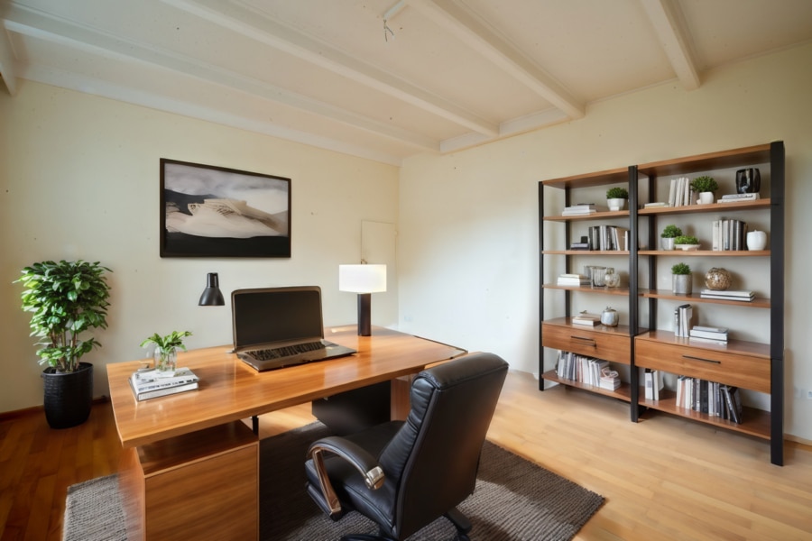 Der Wohnbereich im Erdgeschoss punktet durch einen durchdachten Schnitt und viele individuelle Möblierungsmöglichkeiten. Ein großes feststehendes Panoramafenster sorgt für reichlich Tageslicht und einen herrlichen Blick in den Garten. Für wohlige Wärme und eine besondere Atmosphäre an kühlen Tagen sorgt ein futuristisch designter Kamin der Schweizer Firma Tonwerk mit Wärmespeicherfunktion. Ergänzt wird das Erdgeschoss durch ein separates Gäste-WC sowie ein weiteres flexibel nutzbares Zimmer.