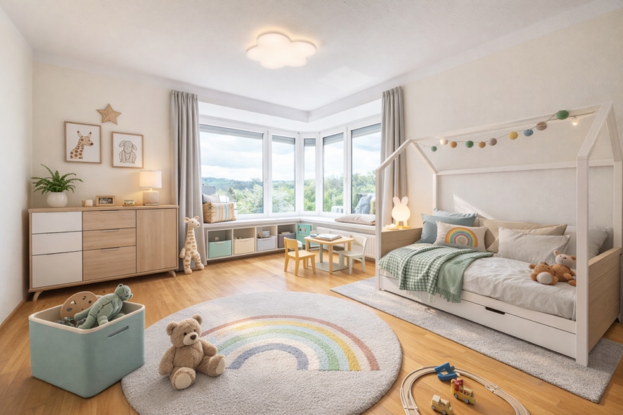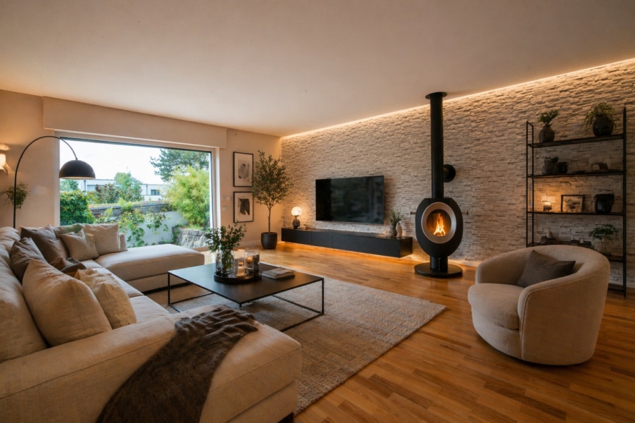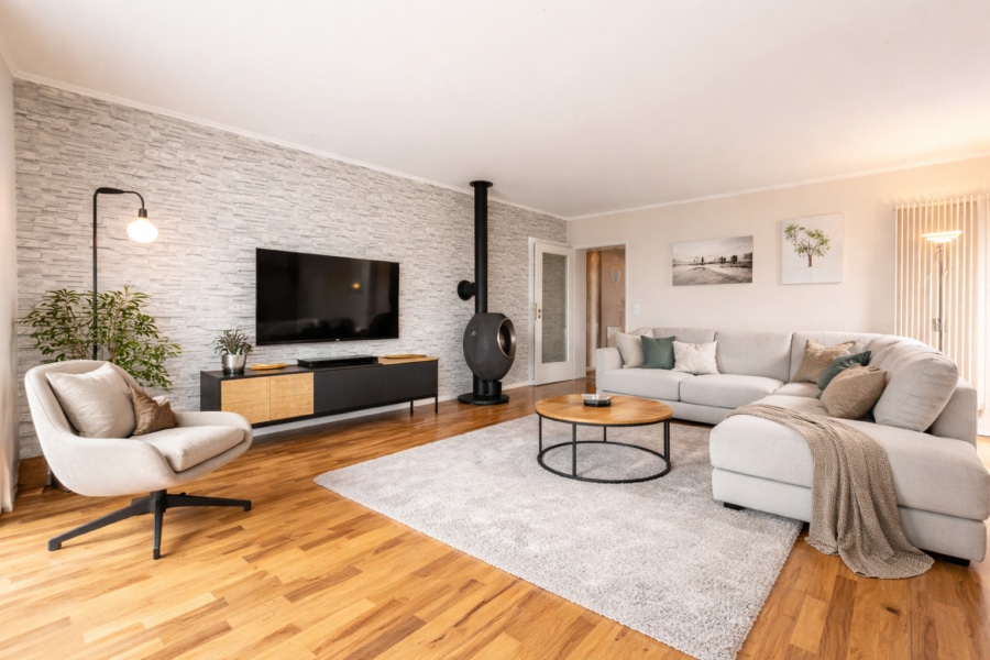 Der Wohnbereich im Erdgeschoss überzeugt durch seine Großzügigkeit und flexible Gestaltungsmöglichkeiten. Ein großes Panoramafenster sorgt für optimale Lichtverhältnisse und einen freien Blick ins Grüne. Der hochwertige Kaminspeicherofen der Firma Tonwerk setzt nicht nur optische Akzente, sondern sorgt auch für angenehme Wärme. Ergänzt wird diese Ebene durch ein Gäste-WC sowie ein weiteres vielseitig nutzbares Zimmer.