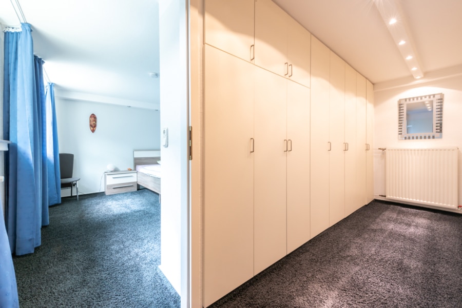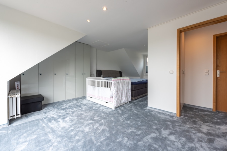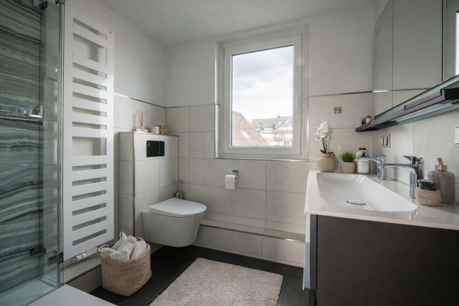 Die zweite Wohneinheit erstreckt sich über das Ober- und Dachgeschoss und bietet ein großzügiges Raumgefühl. Im Obergeschoss befinden sich ein modernisiertes Tageslichtbad (2024), ein flexibel nutzbares Zimmer sowie ein lichtdurchfluteter Wohn- und Essbereich. Das Dachgeschoss überzeugt mit einem weiteren Schlafzimmer, Zugang zur großzügigen Dachterrasse mit Südwest-Ausrichtung sowie einem weiteren modernisierten Badezimmer aus dem Jahr 2023.