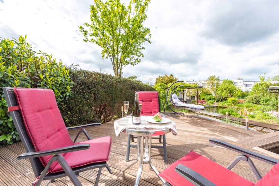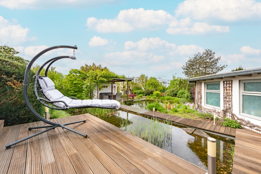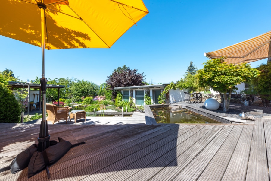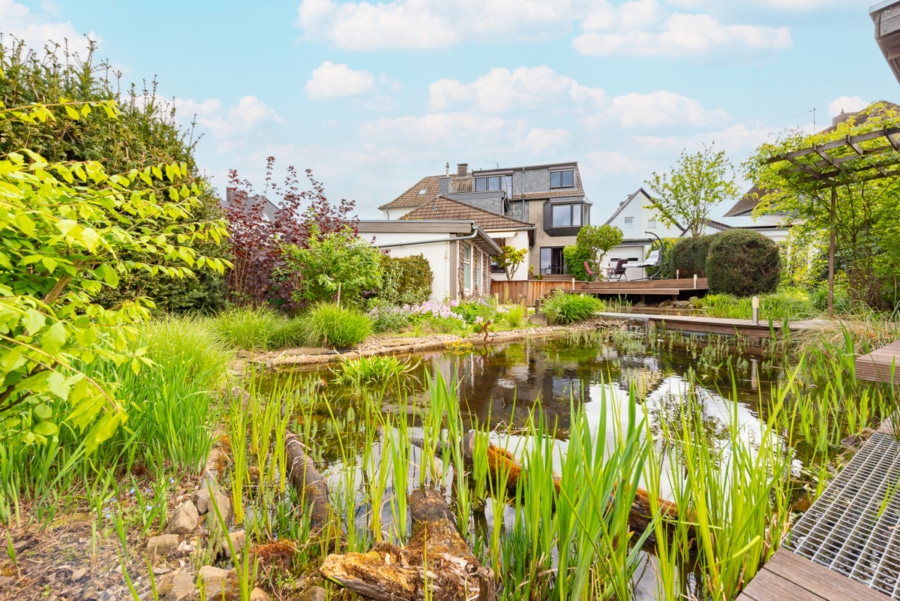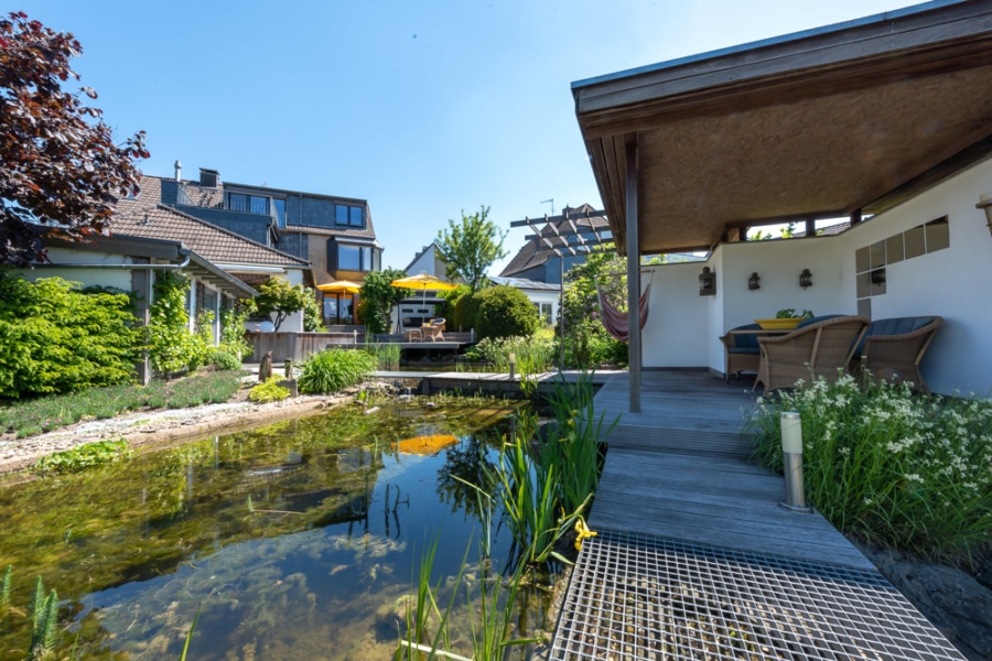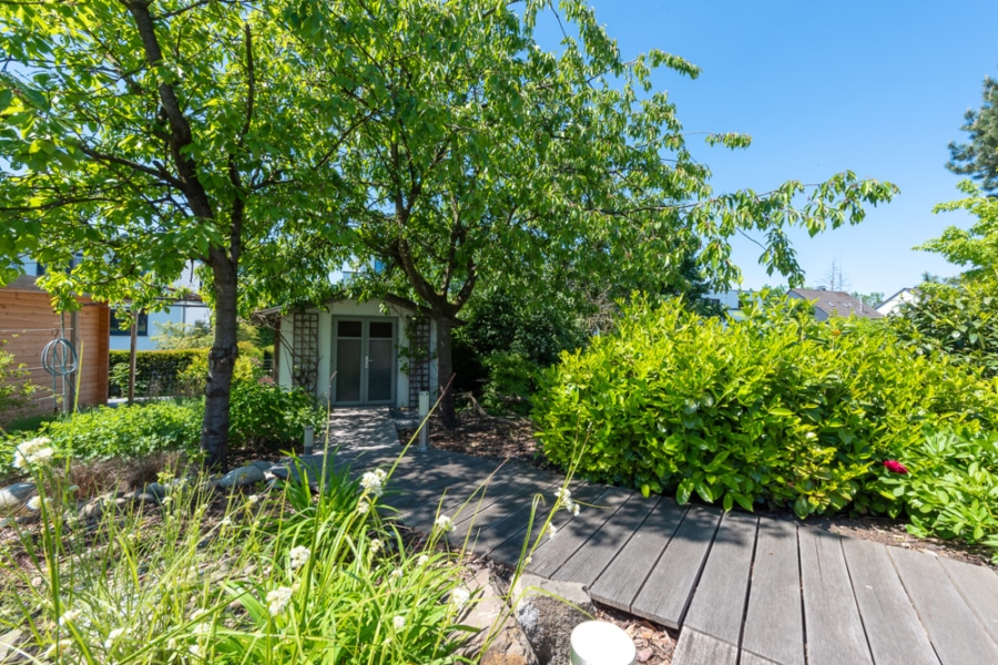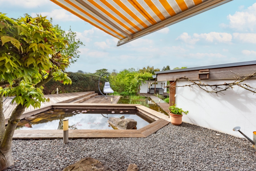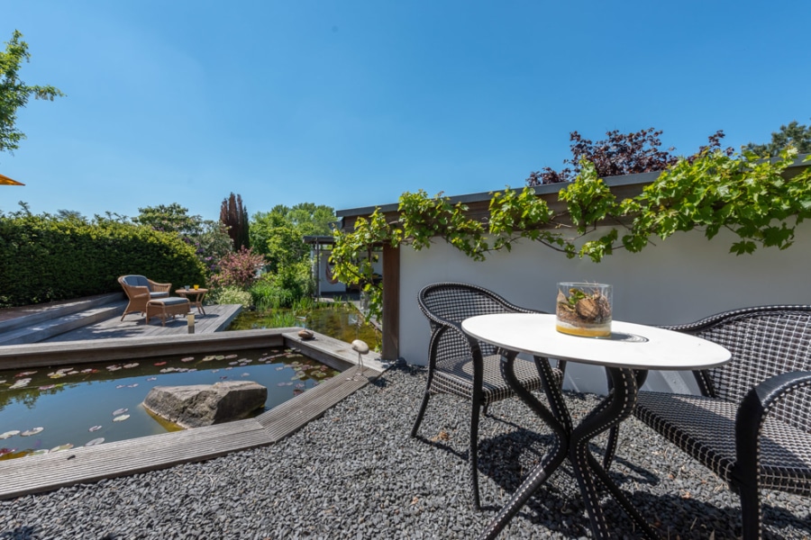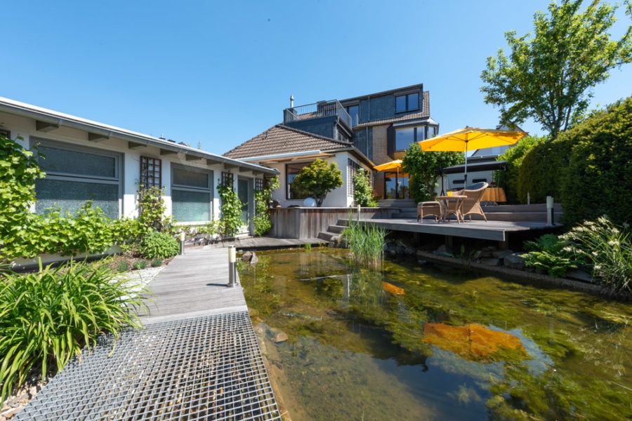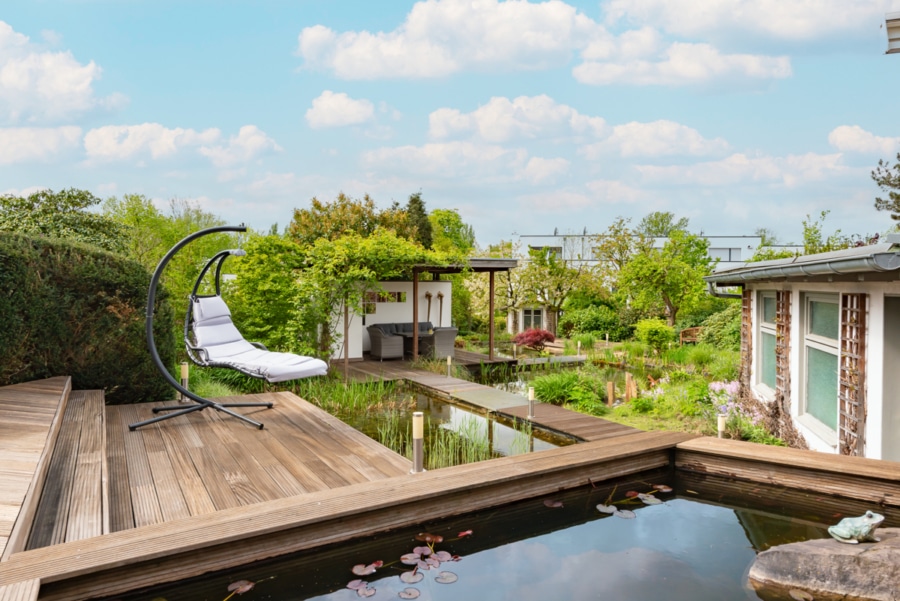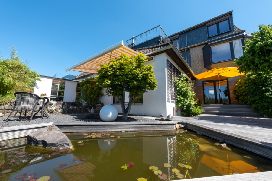 Der Außenbereich ist liebevoll gestaltet und bietet mit seinen Terrassen, Wasserflächen und Rückzugsorten eine besondere Aufenthaltsqualität. Eine Garage mit Gartenzugang, ein Technikhaus sowie ein Gartenhaus komplettieren dieses attraktive Gesamtangebot.